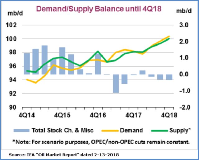В последнем отчете МЭА, который был опубликован 13 февраля 2018 г., сообщалось, что члены ОПЕК на 137% выполнили свое производственное соглашение, а Россия, не входящая в ОПЕК, выполнила условия соглашения на 85%. Настоящая причина того, что ОПЕК снижает производство, заключается в том, что они не могут производить больше нефти, чем производят сегодня.