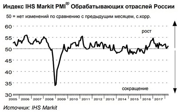 "Результаты последнего исследования IHS Markit PMI обрабатывающих отраслей России указали на умеренное расширение в обрабатывающих отраслях в апреле. Подъем был обусловлен устойчивым ростом объемов производства и ускорением роста новых заказов", - сообщает экономист IHS Markit Шиан Джонс.