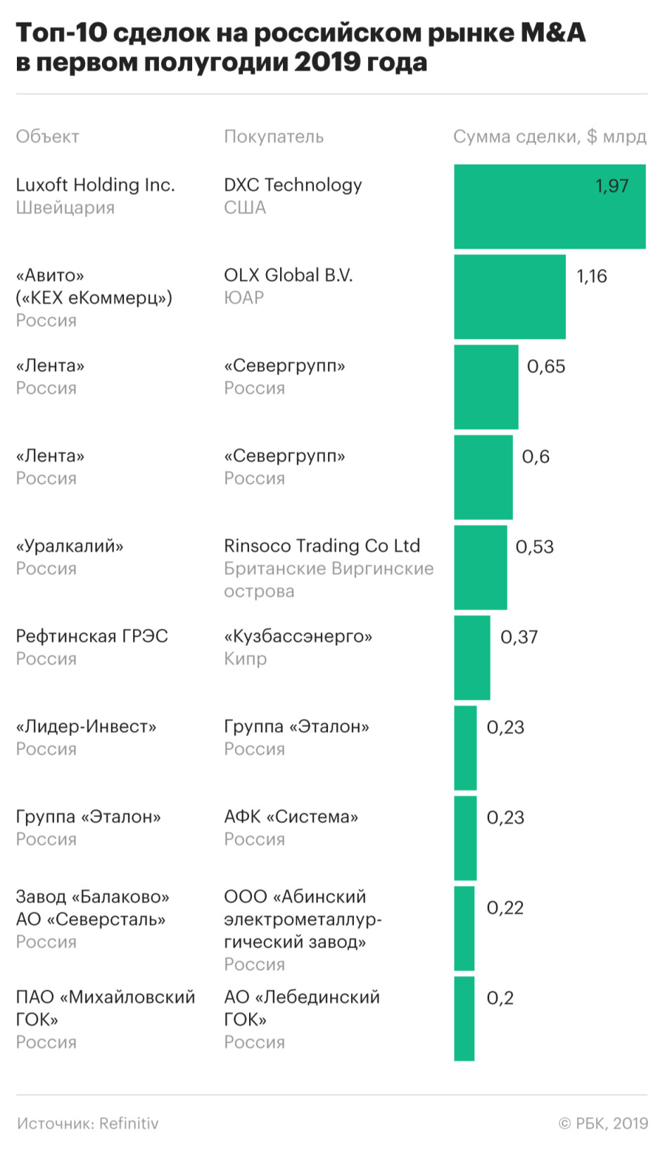 - Сумма сделок по покупке иностранцами российских компаний составила $2,392 млрд — на 22% ниже чем в первом полугодии 2018 года.