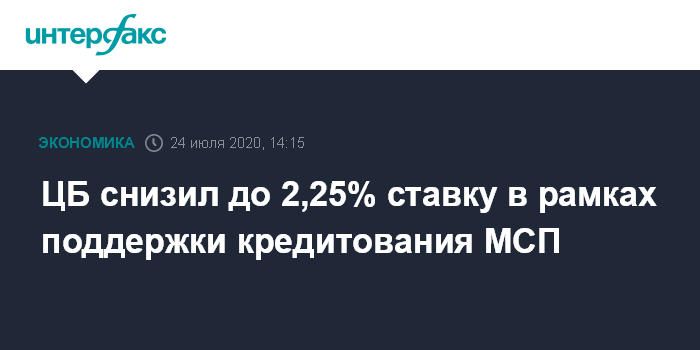 Москва. 24 июля. INTERFAX.RU - Банк России принял решение о снижении с 27 июля 2020 года процентной ставки по кредитам, направленным на поддержку кредитования субъектов малого и среднего предпринимательства (МСП), а также кредитования на неотложные нужды для поддержки и сохранения занятости – с 2,50% до 2,25% годовых, говорится в сообщении регулятора.