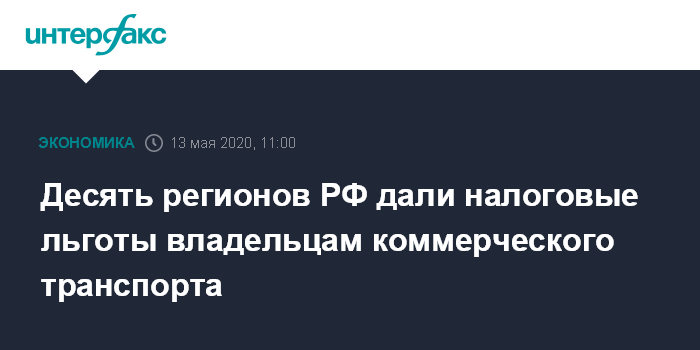 Москва. 13 мая. INTERFAX.RU - Десять российских регионов в рамках антикризисной поддержки бизнеса приняли законодательные акты о налоговых послаблениях для предпринимателей, владеющих коммерческим транспортом. Об этом сообщила Федеральная налоговая служба (ФНС) в среду.