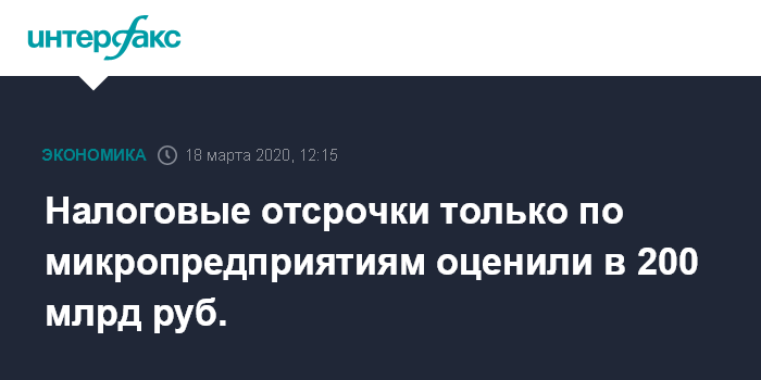 "Сегодня, наверное, будет опубликован план первоочередных мер правительства РФ по преодолению последствий распространения коронавирусной инфекции. Одно из направлений действий - это предоставление трехмесячных налоговых отсрочек. Только по микроорганизациям примерно отсрочка будет стоить, по крайней мере, на этом горизонте, около 200 млрд рублей", - сказала Нестеренко на коллегии Федерального казначейства.