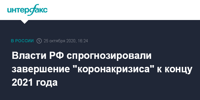 Москва. 25 октября. INTERFAX.RU - Ожидания российских властей и крупного бизнеса о времени завершении кризиса, причиной которого стала пандемия COVID-19, разнятся. Самый оптимистичный вариант - конец 2021 года, пессимистичный - 2023 год.