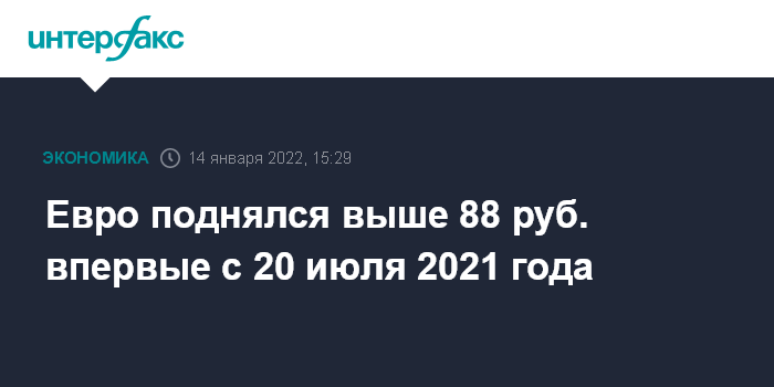 Москва. 14 января. Евро активно дорожает на Московской бирже в пятницу днем, его курс преодолел 88 рублей/EUR1 впервые с 20 июля 2021 года. Доллар также демонстрирует высокие темпы роста, торгуясь по направлению к 77 руб./$1.