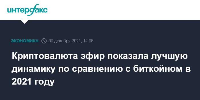 Москва. 30 декабря. Несмотря на то, что наиболее популярной криптовалютой является биткойн, эксперты рекомендуют инвесторам следить за курсом эфира (Ether), который в 2021 году показал динамику существенно лучше, чем более волатильный биткойн.