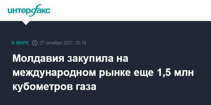 Москва. 27 октября. INTERFAX.RU - Молдавия закупила в среду на международном рынке еще 1,5 млн кубометров газа, сообщила в среду вечером пресс-служба Агентства государственной собственности по итогам проведенного тендера.