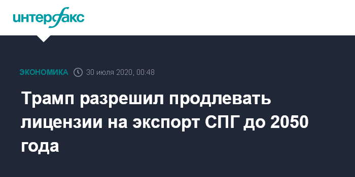 Москва. 30 июля. INTERFAX.RU - Президент США Дональд Трамп объявил о решении разрешить продлевать лицензии на экспорт американского сжиженного природного газа (СПГ) до 2050 года.