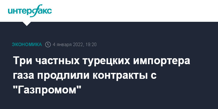 Неясно, продолжились ли поставки с началом января 2022 года, но два источника ICIS сообщили, что Enerco Enerji и Avrasya Gaz, возможно, продлили на два года свои контракты с "Газпромом", которые истекли в конце 2021 года. Согласно первоначальным документам, Enerji собиралась импортировать из России 2,5 млрд кубометров в год, а Avrasya Gaz - 0,5 млрд кубометров в год.
