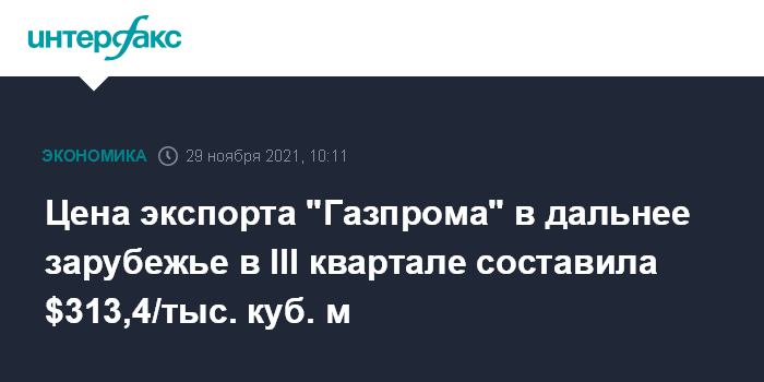Москва. 29 ноября. Ключевой для отчетности "Газпрома" показатель - цена экспорта газа в страны дальнего зарубежья - в третьем квартале 2021 года составил $313,4 за тысячу кубометров (консенсус-прогноз "Интерфакса" $318,7) после $224,4 во втором и $193,9 в первом квартале, следует из отчета компании.