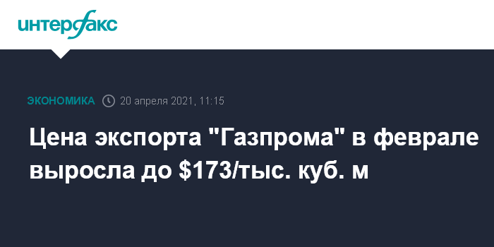 Москва. 20 апреля. INTERFAX.RU - Средняя цена экспорта российского газа (в дальнее и ближнее зарубежье) в феврале 2021 года выросла до $173 за тысячу кубометров после $169 за тысячу кубов в январе, следует из данных Федеральной таможенной службы (ФТС России).