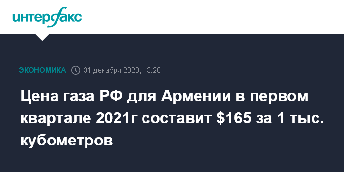 Москва. 31 декабря. INTERFAX.RU - Цена российского газа для Армении в первом квартале 2021 года останется на уровне 2020 года и будет равна $165 за 1 тыс. кубометров, сообщили "Интерфаксу" в офисе вице-премьера Армении Мгера Григоряна.