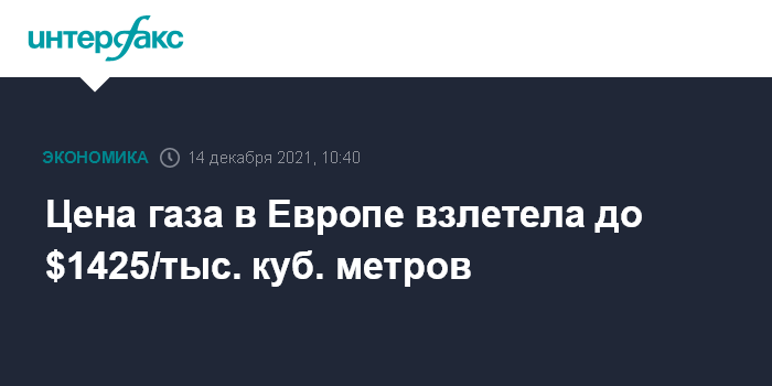 Москва. 14 декабря. Спотовая цена газа в Европе превысила $1400/тыс. куб. м, что является максимальным показателем с начала октября, когда цена взлетала почти до немыслимых $2000 за тысячу кубов.