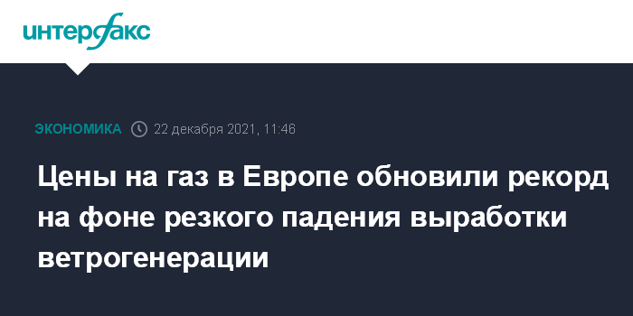 Москва. 22 декабря. Спотовая цена газа в Европе обновила рекорды, достигнув днем ранее почти $2200 за тысячу кубометров, на фоне резкого падения выработки электроэнергии из возобновляемых источников (до трехмесячного минимума).