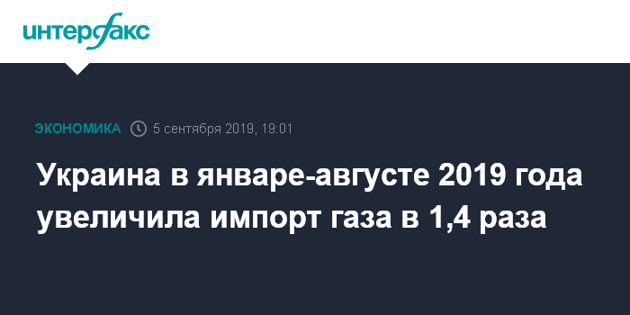 Москва. 5 сентября. INTERFAX.RU - Украина в январе-августе 2019 года увеличила импорт природного газа на 39,7% по сравнению с аналогичным периодом 2018 года (в 1,4 раза) - до 9 млрд 603,6 млн кубометров, свидетельствуют оперативные данные АО "Укртрансгаз".