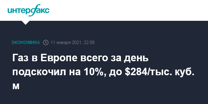 Цена газа на голландском хабе TTF (контракт "на сутки вперед") с поставкой во вторник выросла до $284 за тысячу кубометров после предыдущего пика в $258 с поставкой в понедельник. Рост составил более 10% - это самый большой скачок котировок с начала зимы.