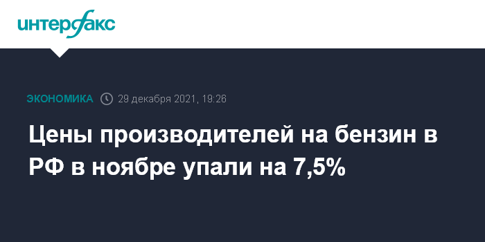 Москва. 29 декабря. Цены производителей на бензин в РФ в ноябре 2021 года упали на 7,5% по сравнению с предыдущим месяцем после снижения на 1,2% в октябре. По сравнению с началом года цены производителей на бензин в РФ выросли на 21,9%, сообщила в среду Федеральная служба государственной статистики (Росстат).