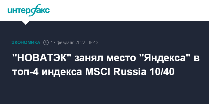 Москва. 17 февраля. "Яндекс" уступил место в топ-4 индекса MSCI Russia 10/40 "НОВАТЭКу" по итогам февральской ребалансировки, говорится в сообщении индексного провайдера MSCI.
