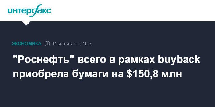 Москва. 15 июня. INTERFAX.RU - "Роснефть" с начала программы обратного выкупа (buyback) приобрела 35 710 171 ценную бумагу, сообщила компания.