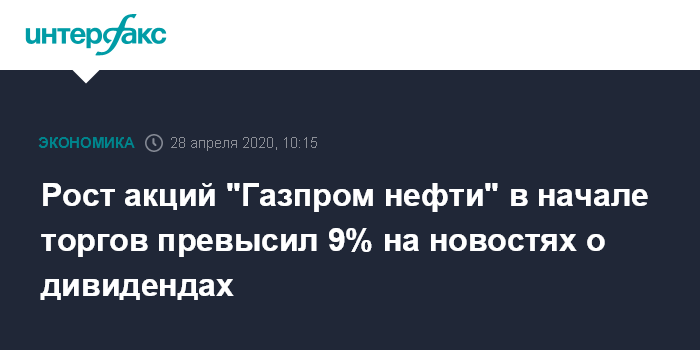 Рост акций "Газпром нефти" в начале торгов на Московской бирже во вторник превышал 9% (до 344,9 рубля за штуку) на новостях о дивидендах.