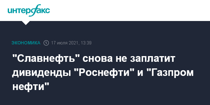 Москва. 17 июля. INTERFAX.RU - Акционеры "Славнефти", которая на паритетной основе принадлежит "Роснефти" и "Газпром нефти", на годовом собрании, которое прошло в заочной форме, приняли решение не объявлять дивиденды за 2020 год, говорится в сообщении компании.