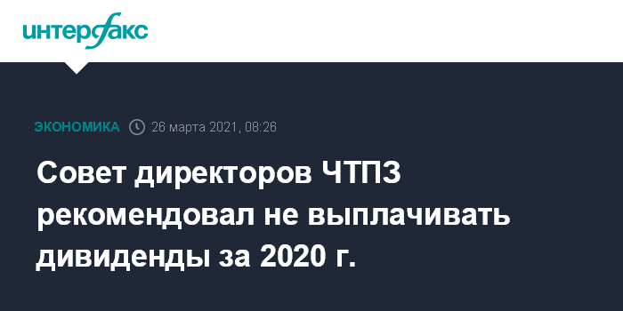 Совет директоров ПАО "Челябинский трубопрокатный завод" по итогам состоявшегося 25 марта заседания рекомендовал общему собранию акционеров не объявлять и не выплачивать дивиденды за 2020 год, говорится в сообщении компании.
