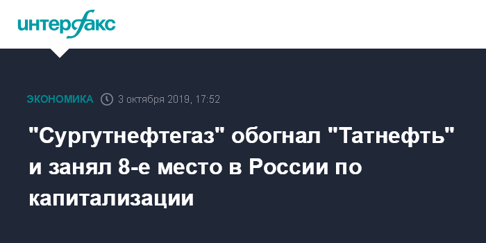 Москва. 3 октября. INTERFAX.RU - Капитализация "Сургутнефтегаза" вечером 3 октября достигла 1 трлн 560,6 млрд рублей, компания вышла по этому показателю на 8-е место в России, которое прежде занимала "Татнефть".