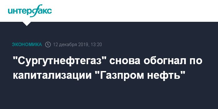 Москва. 12 декабря. INTERFAX.RU - "Сургутнефтегаз" за счет ралли обыкновенных акций на "Московской бирже" вышел на 7-е место по рыночной капитализации, потеснив "Газпром нефть". Это произошло в отсутствие новостей. В прошлый раз "Сургутнефтегаз" обгонял "Газпром нефть" в октябре.