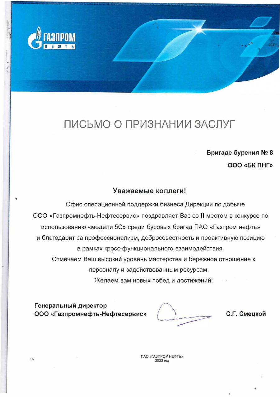В связи с почетным вторым местом в Конкурсе поздравительное письмо в адрес Буровой Компании ПНГ направил генеральный директор ООО «Газпромнефть-Нефтесервис» С.Г.Смецкой, который выразил благодарность ООО «БК ПНГ» за профессионализм, добросовестный труд, бережное отношение к персоналу и задействованным ресурсам.