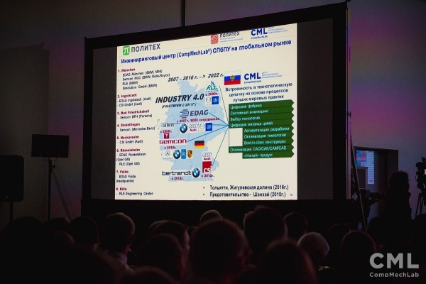 Руководитель Инжинирингового центра СПбПУ перечислил основные составляющие, позволившие добиться такого результата. В том числе, это постоянная работа с лидерами, в первую очередь, автомобильной промышленности, по выполнению проектов, о которых мир узнает в лучшем случае через год-два – это позволяет команде CompMechLab® все время оставаться «на фронтире» научных разработок. Еще одно преимущество - использование практически всех CAD / CAE / CFD / FSI / MBD / EMA / CAO / CAM / CAAM / HPC технологий, которые применяют все крупнейшие глобальные промышленные компании, - что с одной стороны, дает возможность мгновенно «встать на рельсы» практически любого заказчика, с другой стороны, комплексируя эти технологии, удается получить решение задачи, которая нередко относилась заказчиком к категории «нерешаемых». Кроме того, для эффективного управления процессами разработки и формирования цепочек технологий в ИЦ СПбПУ разработана собственная CML-SPDM система.