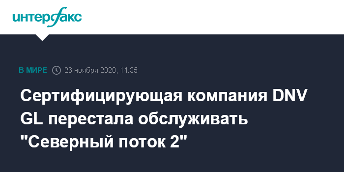 Москва. 26 ноября. INTERFAX.RU - Сертификационная компания DNV GL перестала обслуживать проект Nord Stream 2, сообщает Bloomberg.
