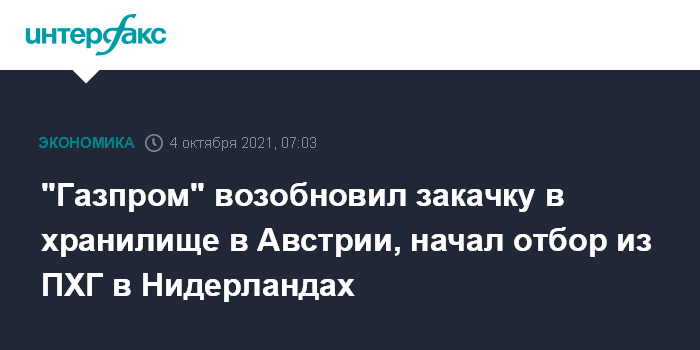 "Газпром" возобновил закачку в хранилище в Австрии, начал отбор из ПХГ в Нидерландах