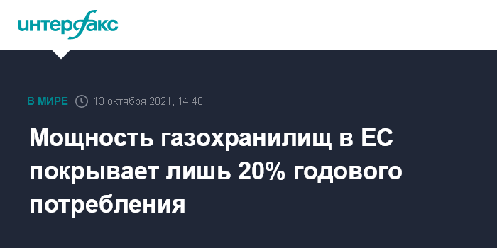 Москва. 13 октября. INTERFAX.RU - Мощность газохранилищ, имеющихся в распоряжении ЕС, позволяет покрывать только 20% годового потребления газа, сообщила в среду еврокомиссар по вопросам энергетики Кадри Симсон.