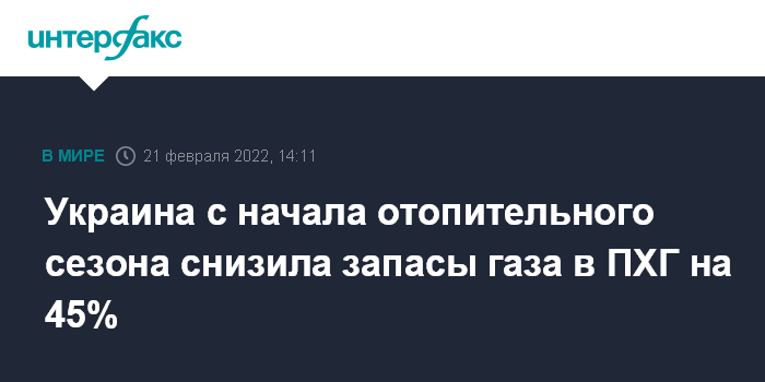 Москва. 21 февраля. Украина с начавшегося 2 октября 2021 года отопительного сезона по 20 февраля 2022-го снизила запасы природного газа в своих подземных хранилищах (ПХГ) на 45% – до 10 млрд 287,4 млн куб. м. Об этом свидетельствуют данные оператора хранилищ АО "Укртрансгаз".