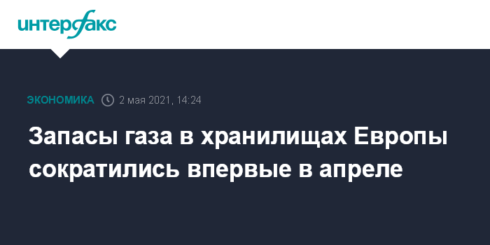 Запасы газа в подземных хранилищах Европы за апрель 2021 года не выросли, а сократились - впервые за историю наблюдений публичной базы Gas Infrastructure Europe (c 2011 года). На 31 марта уровень запасов был 30,06%, а на 30 апреля - 29,91%.