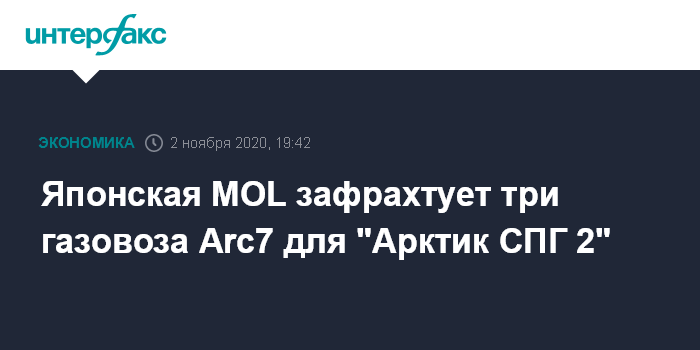 Москва. 2 ноября. INTERFAX.RU - Японская MOL подписала чартерные соглашения на три газовоза ледового класса Arc7 с ООО "Арктик СПГ 2", крупнейшим акционером которого является "НОВАТЭК", говорится в пресс-релизе японской компании.