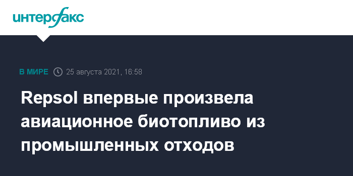 Москва. 25 августа. INTERFAX.RU - Испанская Repsol впервые произвела партию биотоплива для авиации из промышленных отходов на своем нефтеперерабатывающем заводе Petronor в Бильбао, сообщается в пресс-релизе компании.