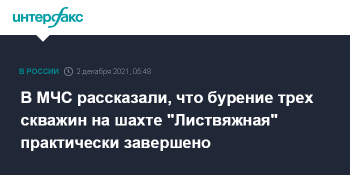 Москва. 2 декабря. Бурение трех скважин, необходимых для устранения последствий аварии на шахте "Листвяжная" в Кемеровской области, практически завершено, сообщили в четверг в МЧС РФ.