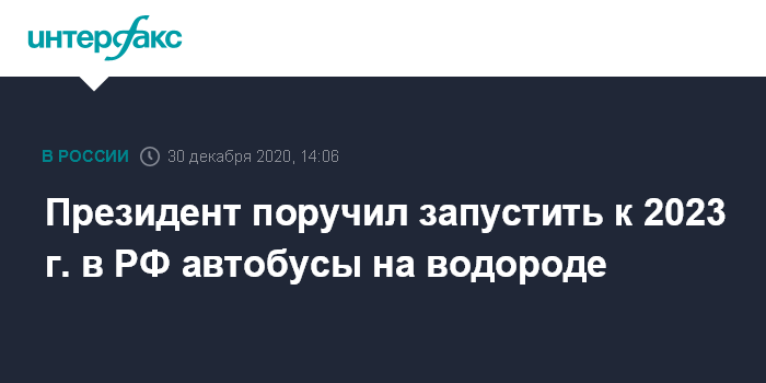 Москва. 30 декабря. INTERFAX.RU - Городской автобус на водородном топливе должен появиться в России к 2023 году, это будет способствовать улучшению экологической обстановки в городах-миллионниках, заявил президент РФ Владимир Путин.