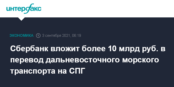 Москва. 3 сентября. INTERFAX.RU - Сбербанк планирует вложить более 10 млрд рублей в перевод дальневосточного морского транспорта на СПГ, соответствующее соглашение о намерениях в рамках ВЭФ-2021 заключили "Сбербанк Лизинг" и ООО "Восточно-арктическая нефтегазовая корпорация" (ВАНК).