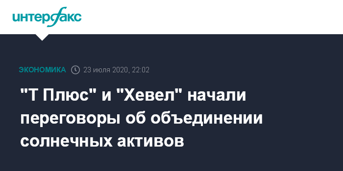 Москва. 23 июля. INTERFAX.RU - ПАО "Т Плюс" и ГК "Хевел" ведут переговоры об объединении активов обеих компаний в сфере солнечной энергетики. Об этом рассказал "Интерфаксу" источник, знакомый с ходом переговоров.