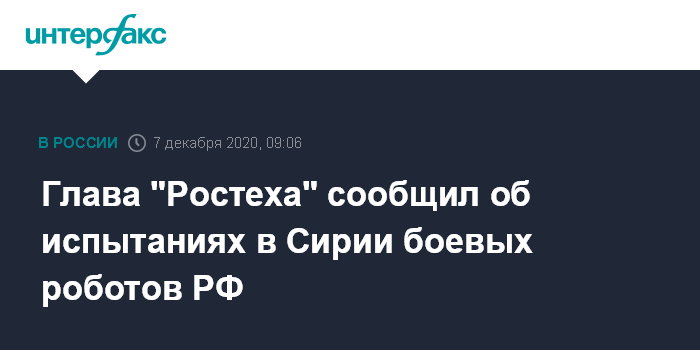 Москва. 7 декабря. INTERFAX.RU - Российские боевые роботы прошли испытания в Сирии, сообщил глава "Ростеха" Сергей Чемезов.