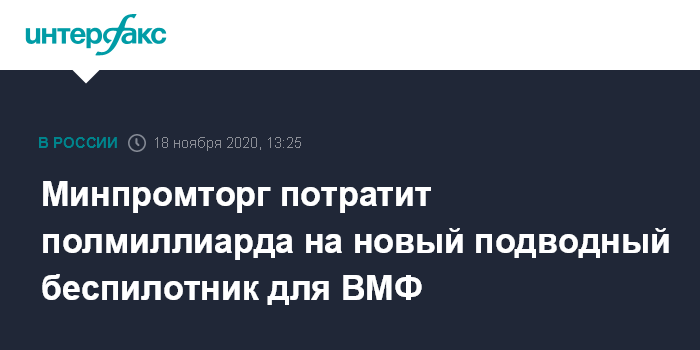 Москва. 18 ноября. INTERFAX.RU - В России планируют к 2024 году разработать перспективный необитаемый подводный аппарат повышенной автономности. Об этом говорится в материалах госзакупок.