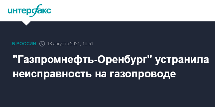 Москва. 18 августа. INTERFAX.RU - Компания "Газпромнефть-Оренбург" сообщила, что устранила неисправность, возникшую минувшей ночью на технологическом газопроводе на восточном участке Оренбургского нефтегазоконденсатного месторождения (ОНГКМ).