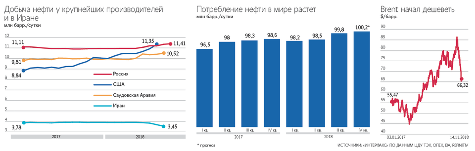 Три ключевых производителя нефти – США, Россия и Саудовская Аравия – качают рекордное количество сырья, поддерживают общемировое производство свыше 100 млн барр. в сутки, пишут аналитики Международного энергетического агентства (МЭА) в обзоре за октябрь. Это, а также смягчение санкций США в отношении иранской нефти (штаты позволили экспортировать ее восьми странам) привело к падению за минувшие две недели стоимости сырья на 13,4% до $65,36 за 1 барр.