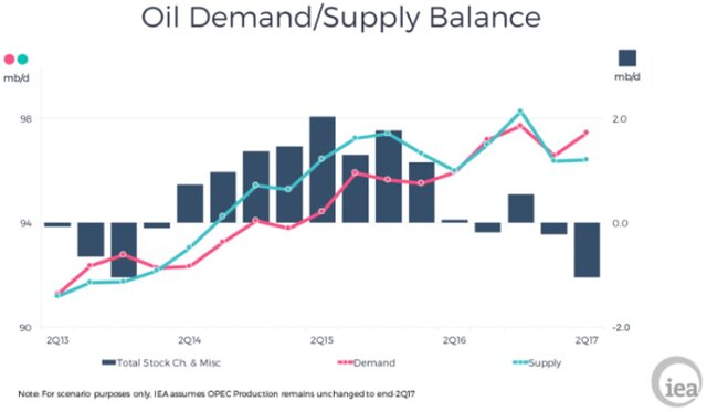 При этом, по данным МЭА, мировые запасы нефти сократились в феврале и марте, однако спрос был более слабым, чем ожидалось ранее. Агентство снизило прогноз роста спроса на нефть в 2017 г. на 100 тыс. баррелей в сутки (б/с) до 1,3 млн б/с. Общий спрос на нефть в 2017 г. составит 97,9 млн б/с, следует из обзора.