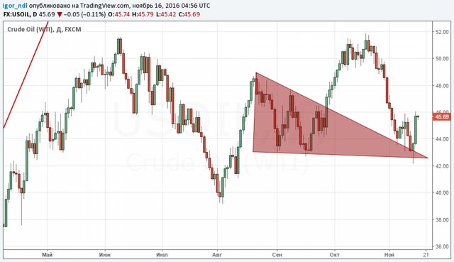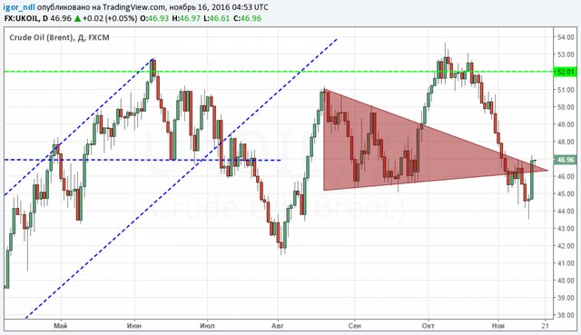 Отметим, что дополнительные консультации пройдут еще 17 ноября. С технической точки зрения картина теперь рисуется более или менее позитивная. Накануне котировки снова пробили треугольник, только уже вверх, и теперь велика вероятность, что рост цен продолжится.